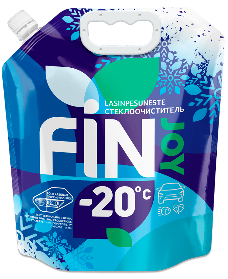 Автоочиститель стекол «FINJOY» создан для использования в зимний период и готов к применению при температуре воздуха до минус 20°С. Предотвращает замерзание системы стеклоомывателей автомобиля, благодаря высокому содержанию спиртов высшей степени очистки. Принципиально новый вид упаковки — многослойный ламинированный пакет «DOY-PACK». Для удобства переноски, в верхней части сделана усиленная пластиковая ручка.