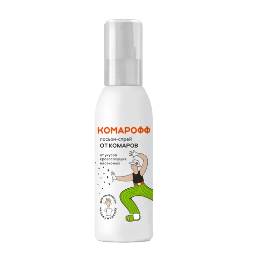 Средство репеллентное «Комарофф-лосьон» спрей 100мл. Предназначен для эффективной защиты от укусов кровососущих насекомых (комаров, мокрецов, москитов, мошек, слепней и блох). Нейтрален для кожи.